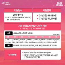 서울형 입원생활비 지원 일수는 연 최대 14일입니다. 2023년 1일 89,250원(2023년도 서울시 생활임금 기준) 연 최대 1,249,500원이었는데 2024년 서울시 생활임금기준이 1일 당 91,480원으로 상향되면서, 연 최대 1,280,720원까지 지원받을 수 있습니다. 이는 입원, 진료, 검진 발생연도에 해당하는 기준을 적용하여 지급하게 됩니다. 적지 않은 금액이니 만큼 꼭 확인하셔서 지급받으시기 바랍니다.