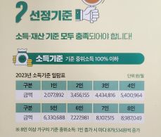 - 소득, 재산 : 신청인과 가구원의 소득합계가 2024년 기준 중위소득 100% 이하이고 재산합계 3억 5천만 원 이하입니다.(중위소득 100 이하 1인가구 :2,228,445 / 2인가구 : 3,682,690 / 3인가구 : 4,714,657 /4인가구 : 5,729,913)